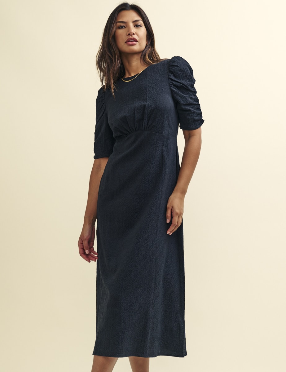 Returning for another season, our Evie tea dress is lightly textured for a summertime feel. Ruched sleeves and a curved waist seam add to the look. Dial yours up with barely-there sandals.
