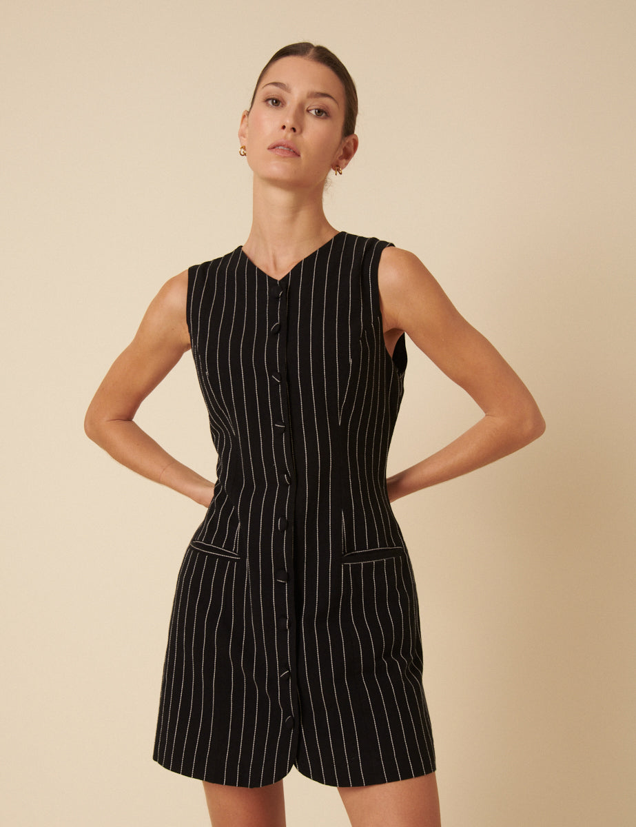 Chic and structured. Coming in classic pinstripe, we love the sleeveless design and button-through front that make it perfect for layering or wearing solo. Pair with sandals or strappy heels, depending on your mood.