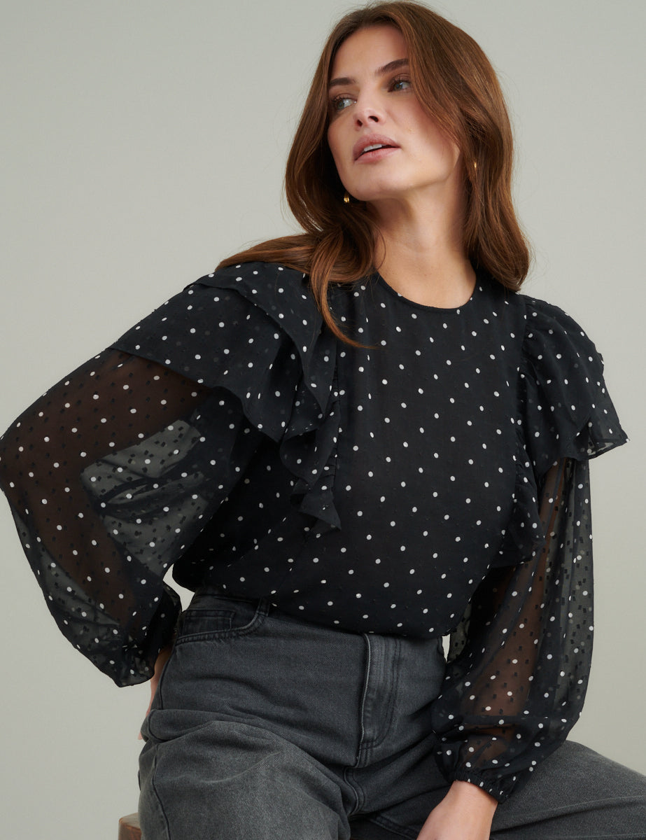 Where wouldn’t you wear our Finola blouse? It’s sure to become a favourite in your wardrobe. Coming in classic black with white polka dots, she’s finished with stylish ruffles at the shoulders. Style with jeans and barely-there sandals.