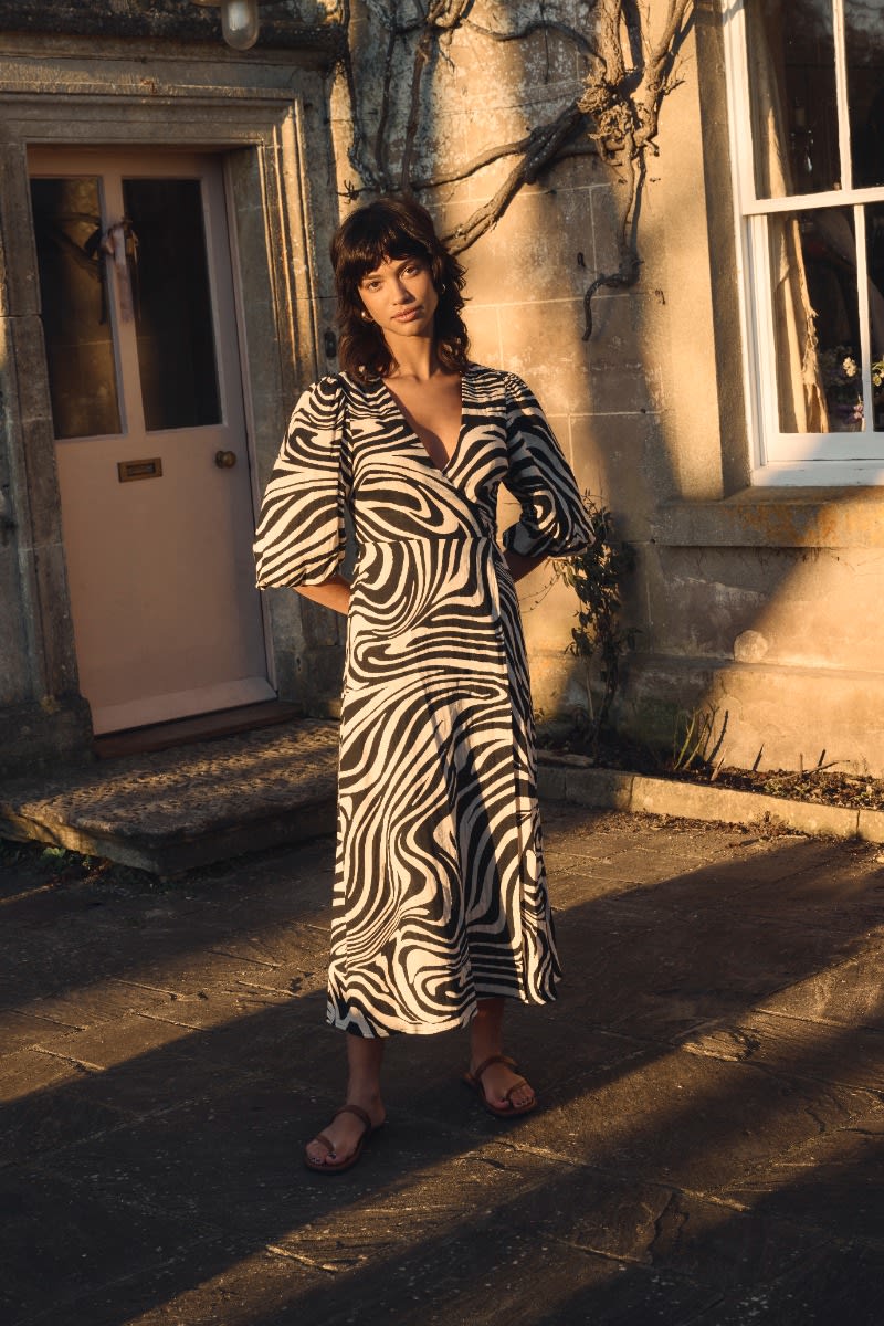 Looking for a dress you can wear anywhere? Enter our girl Regan. Finished with a bow, this midaxi is cut to a wrap style shape made in a black swirl print. Paired with ultra-puff sleeves and an a-line skirt, she’s just what your wardrobe’s always wanted. Slide into suede slip-on shoes and go.
