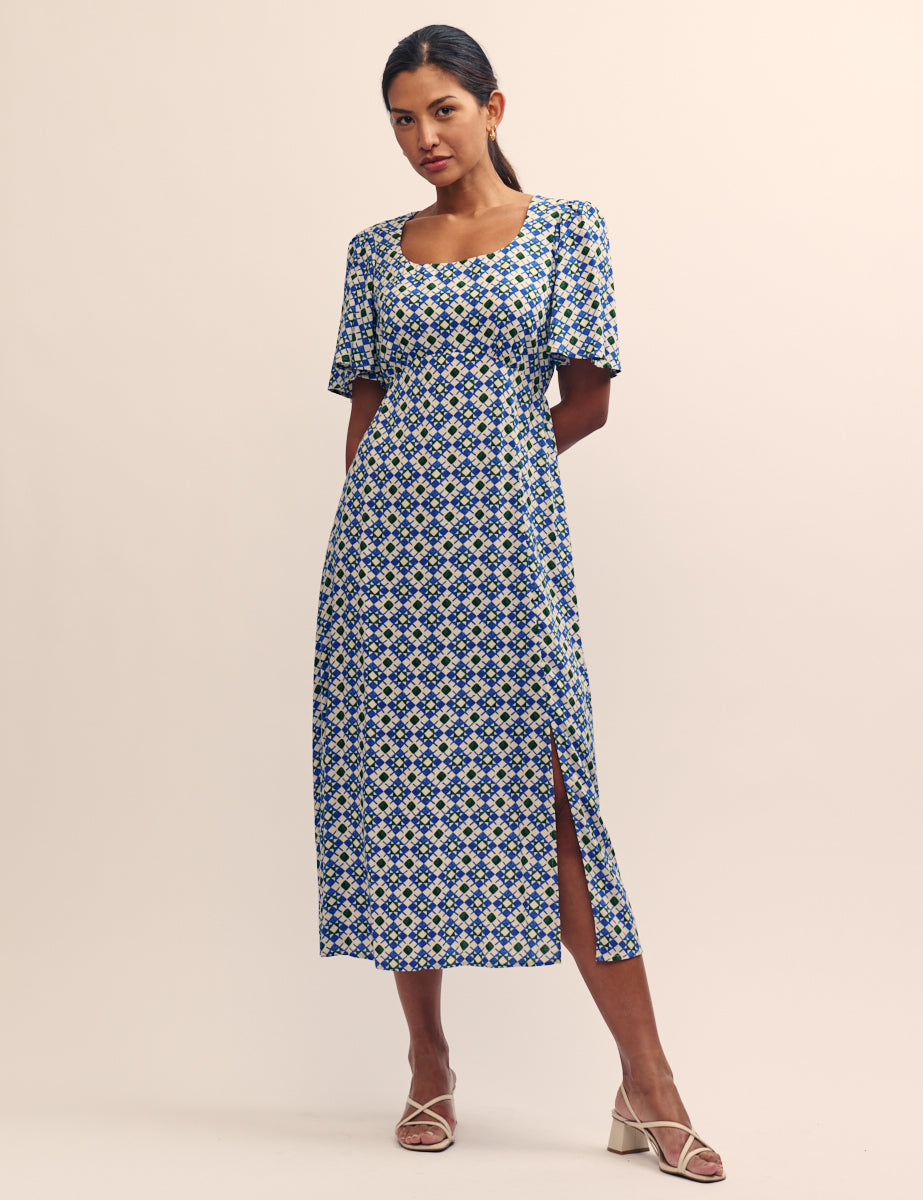 Your favourite Dee Dee dress is here in a brand-new print. She’s light and floaty in a blue, green and white tile design inspired by Mediterranean holidays. Other details include a scoop neck, feminine fluted sleeves and a subtle slit that elongates the leg. Switch between stompy boots and barely-there sandals.
