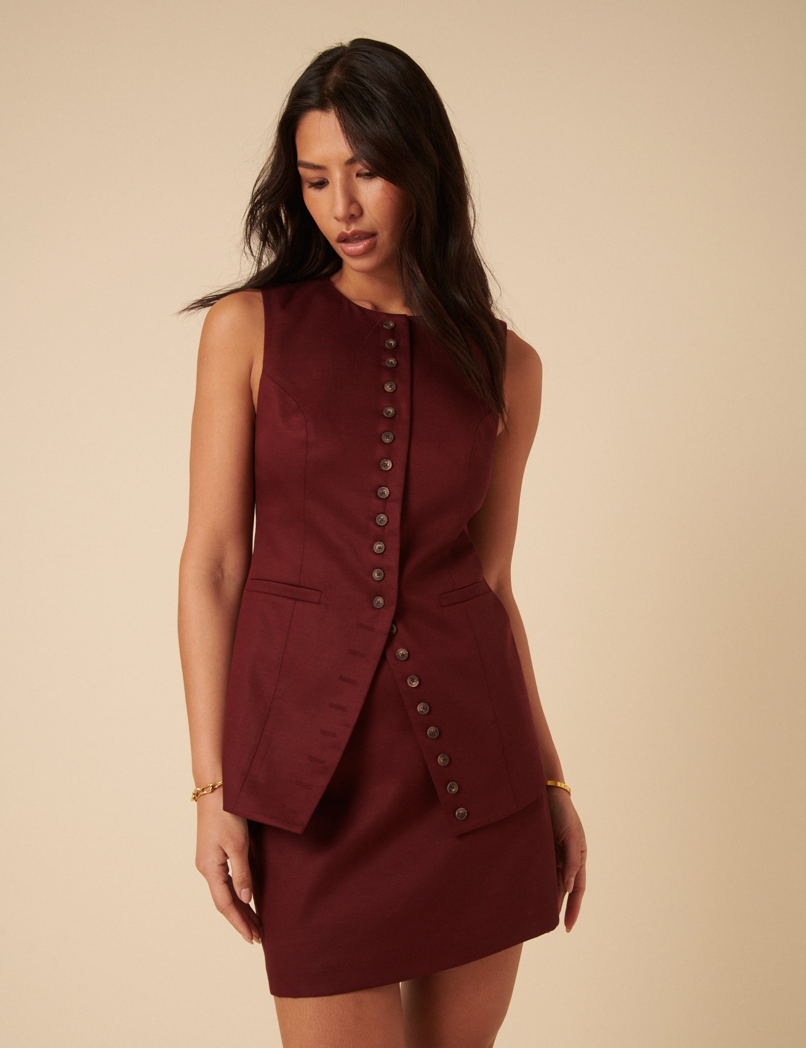 Round neck Button front Adjustable back strap with buckle Designed to be fitted Size tip: we recommend...
