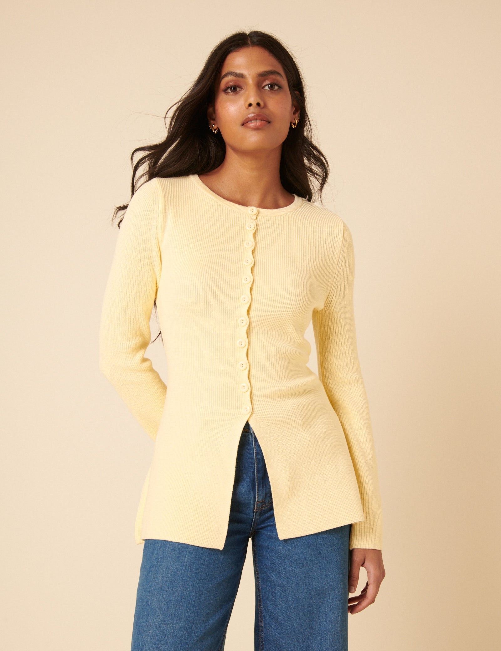 Round neck Button front Long sleeves Open front Soft ribbed texture Relaxed fit Size tip: we recommend...