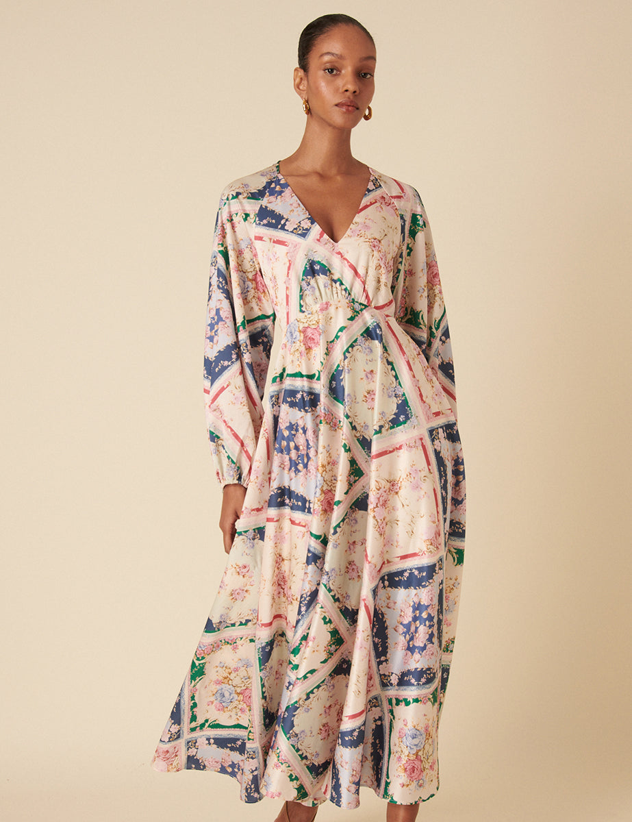 A moment for this floral midaxi. The floaty shape gently skims your frame and features a flattering V-neck. With open back and tie detailing and romantic frills at the hem, she’s sure to illicit compliments. Add some gold notes and sandals for sunny days.