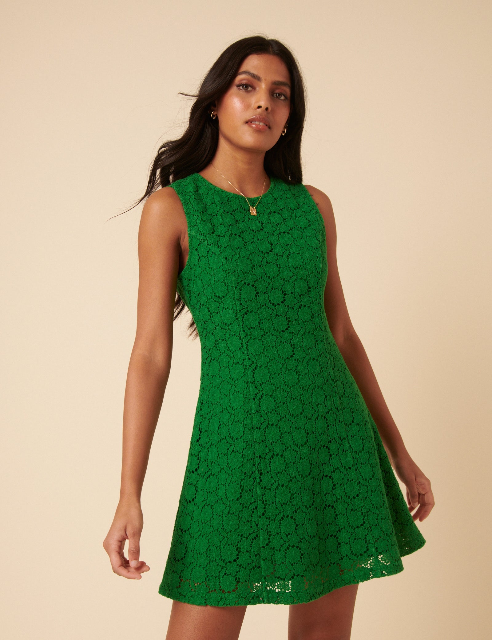 Mini length, major impact. Coming in a statement green shade with all-over broderie detail, we love the easy round neck, seam detail at the bodice and flippy skirt. Just add sandals.