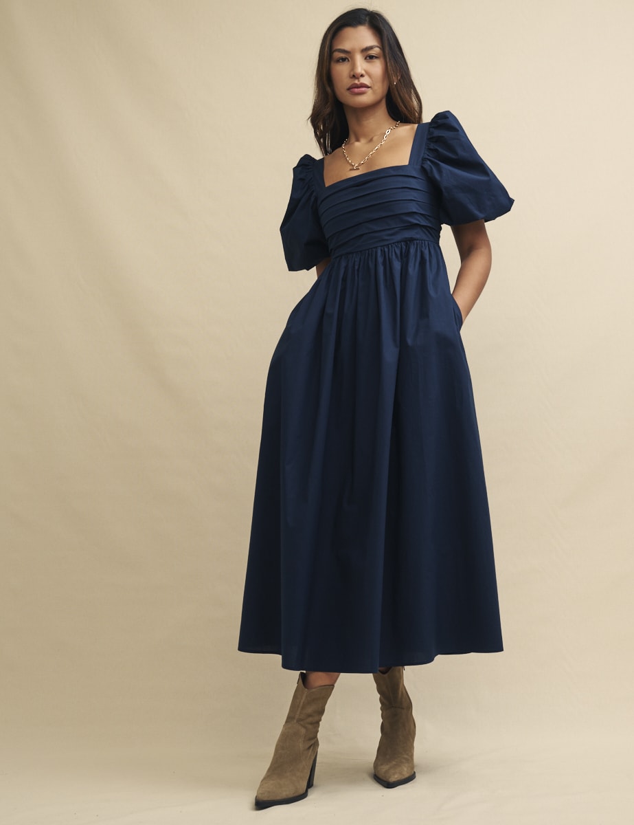Nova, you’re a dream. She’s a stylish navy smock dress that we think you’ll love. The square neckline feels so-now, with statement-making puff sleeves and a pleated skirt. We’ve added a touch of shirring at the back for an always perfect fit. Complete the look with suede boots.