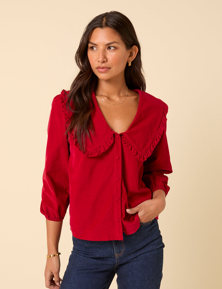 Our Emmie blouse is back, but this time she has long sleeves. Trimmed with a flouncy ruffle, this red shirt is soft and airy. We also love the puff sleeves. Style yours with denim and gold accents.