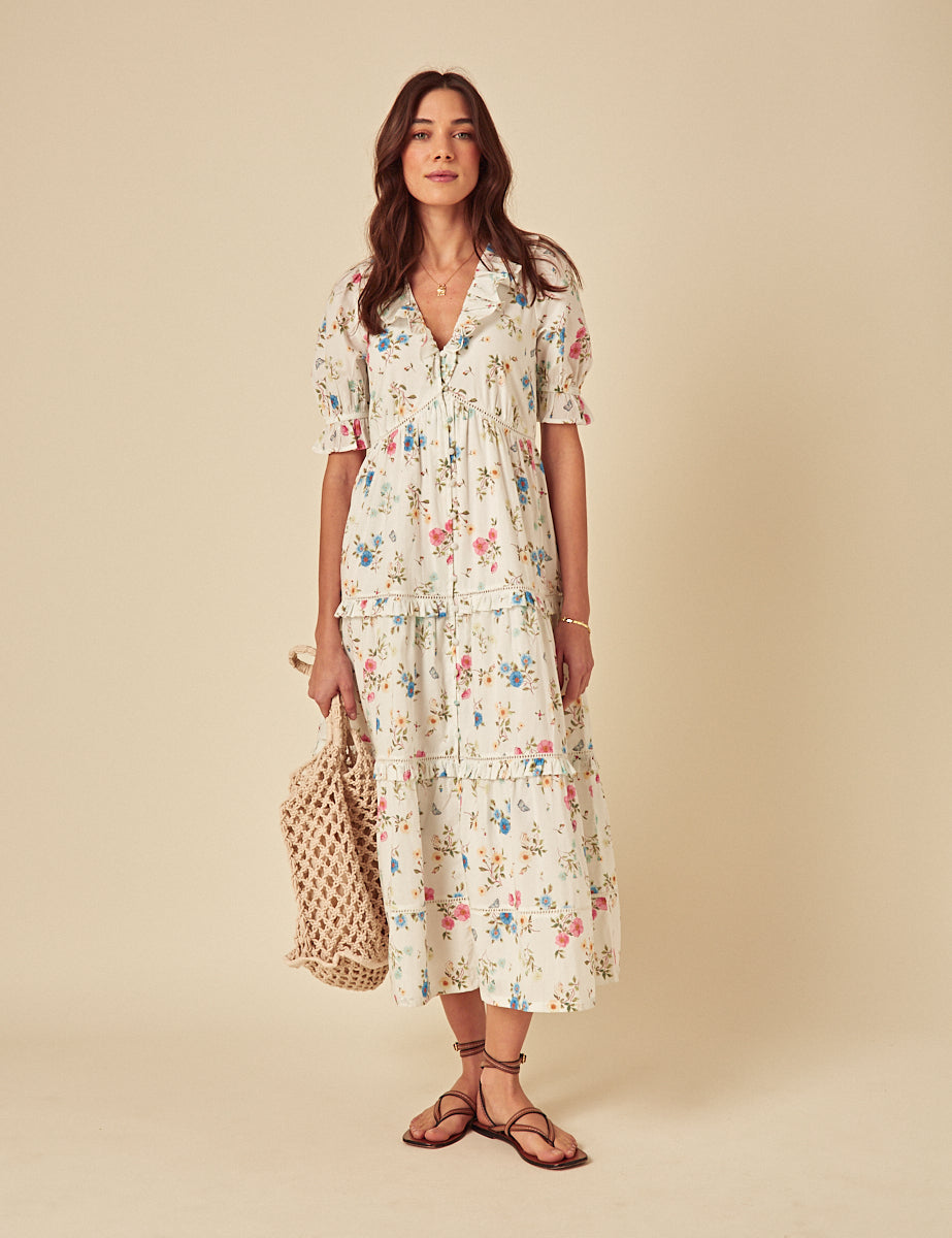 Designed in partnership with Elizabeth Scarlett, this limited-edition collaboration celebrates a love for colour, print, and embroidery, featuring motifs from her original watercolours applied to our iconic designs. The perfect piece for summer. Pretty florals dance across this white dress, featuring a V-neckline, ruffled details, and a button-down front. The tiered skirt adds a playful touch,