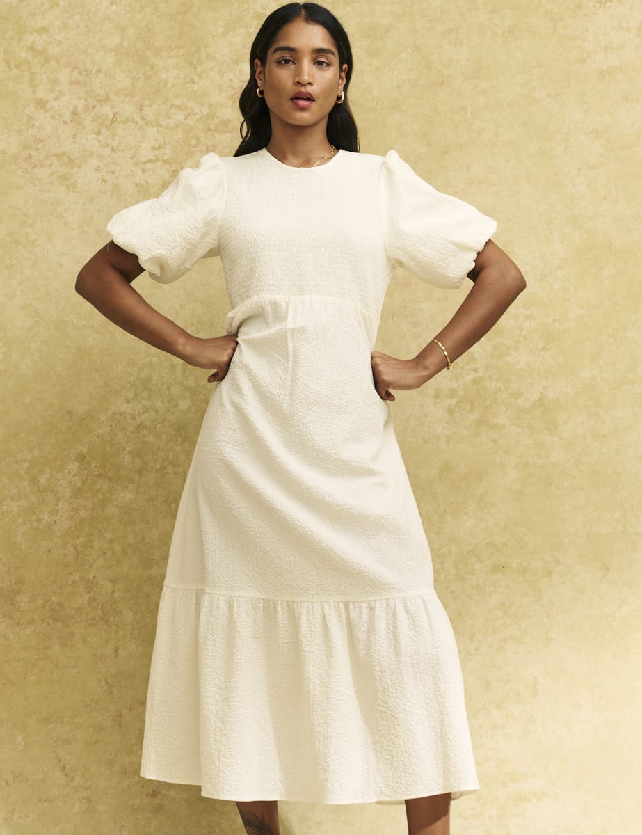 Looking for a new smock dress you’ll wear over and over? Kelsie is the one. This one comes in white,We’re also really into her extra puffy sleeves and floaty-tiered hem. Decorative shirring around the waist is as flattering as it is comfortable. Style yours with chunky slides.