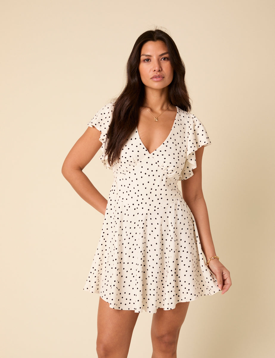 Meet our Loubelle mini dress. Printed in a classic polka dot, she’s sure to be a garden party favourite with fluttery sleeves and a plunge neckline that adds to the look.